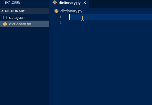 ডাউনলোড হয়ে গেলে json ফাইলটি একটি ফোল্ডারে রাখুন, ফোল্ডারের নাম দিন dictionary (বা আপনার পছন্দমত যেকোন নাম)। এরপর সেই ফোল্ডারে আর একটি ফাইল তৈরী করুন পাইথনের এক্সটেনশনে, নাম দিন dictionary.py (বা আপনার পছন্দমত যেকোন নাম)। এরপর সেই ফোল্ডারটি যেকোন একটি লাইট কোড এডিটরে ওপেন করুন। বিভিন্ন ফ্রি কোড এডিটর আপনি ব্যবহার করতে পারেন VS Code, Sublime, Atom, Brackets, Notepad++ etc. আমি সাধারণ VS Code ব্যবহার করি।